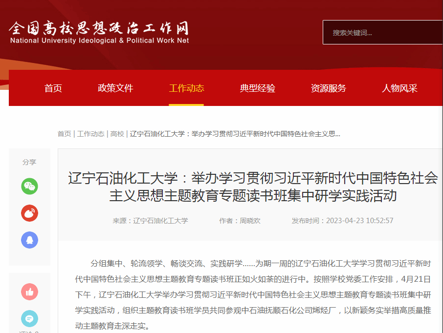 编者按:近日,全国高校思想政治工作网、辽宁高校思政微信公众号、辽宁日报·北国号等媒体平台对我校举办学习贯彻习近平新时代中国特色社会主义思想主题教育专题读书班集中研学实践活动,组织主题教育读书班学员共同参观中石油抚顺石化公司烯烃厂,以新颖务实举措高质量推动主题教育走深走实进行了宣传报道。现将相关报道转载如下: