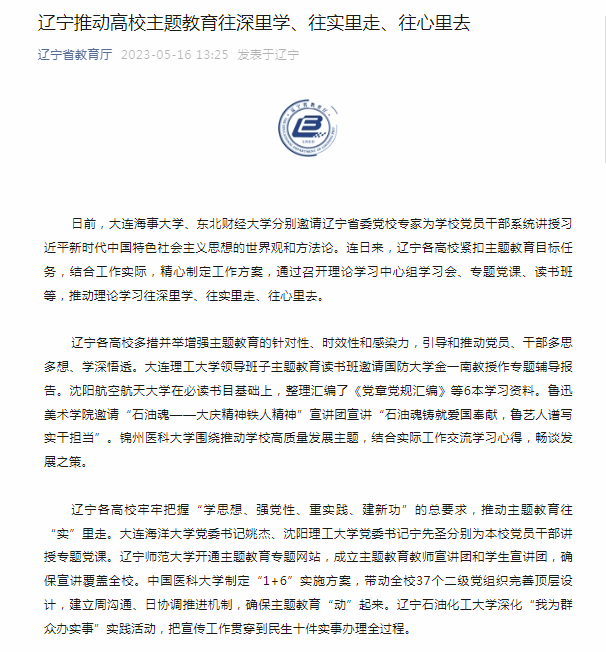 辽宁省教育厅:辽宁推动高校主题教育往深里学、往实里走、往心里去