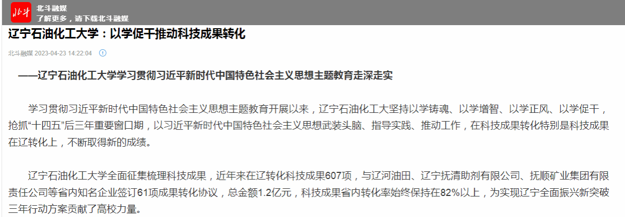 编者按:近日,北斗融媒对我校坚持以学铸魂、以学增智、以学正风、以学促干,抢抓“十四五”后三年重要窗口期,以习近平新时代中国特色社会主义思想武装头脑、指导实践、推动工作,在科技成果转化特别是科技成果在辽转化上,不断取得新的成绩进行了宣传报道。现将相关报道转载如下: