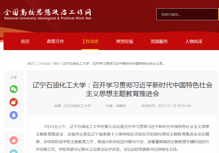编者按:近日,全国高校思想政治工作网、辽宁日报·北国号等媒体平台对我校召开主题教育推进会,全面传达落实辽宁省委第十八指导组在沈阳召开的组内高校主题教育推进会会议精神,总结前阶段学校主题教育工作,客观分析存在的问题与不足,部署暑假期间主题教育关键阶段的升华突破工作进行了宣传报道。现将相关报道转载如下: