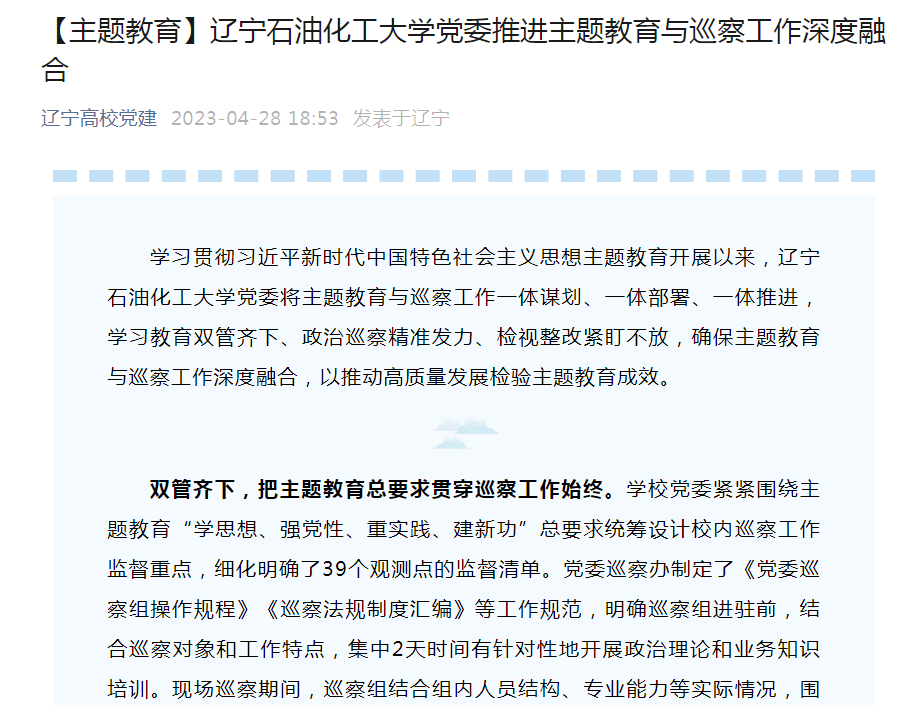 编者按:近日,辽宁高校党建微信公众号对我校党委将主题教育与巡察工作一体谋划、一体部署、一体推进,学习教育双管齐下、政治巡察精准发力、检视整改紧盯不放,确保主题教育与巡察工作深度融合,以推动高质量发展检验主题教育成效作了报道。现将相关报道转载如下: