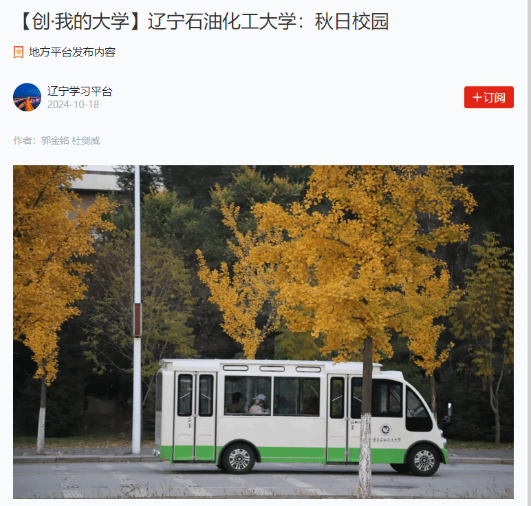 编者按:11月4日,学习强国辽宁学习平台对我校新媒体中心学生郭金铭 杜剑威拍摄的校园秋色以图集的形式进行了宣传。现将相关报道转载如下: